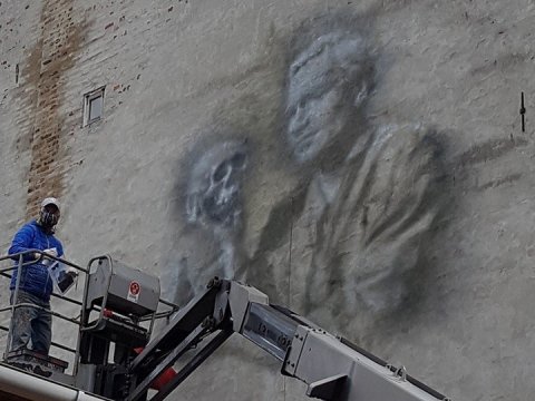 Den italienske kunstner Eron er ved at male Sir Laurence Olivier som Hamlet, på en husgavl i Møllestæde i Helsingør.